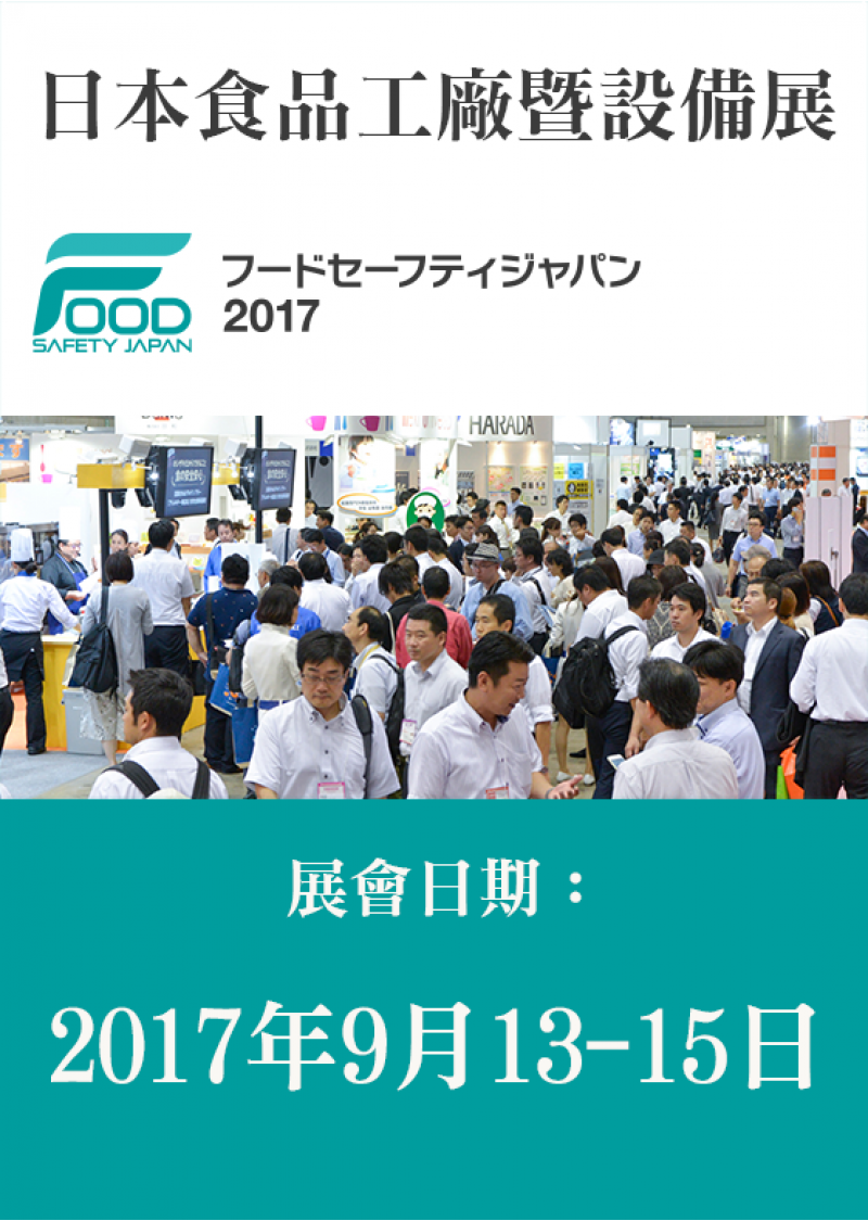 | 展會日期:2017 年 9 月13 -15日 展會地點:日本 - 東京|有明國際展示場 - 東大廳(Tokyo Big Sight - East Hall) 主辦單位:日本食品產業協會、日本食品衛生協會 |