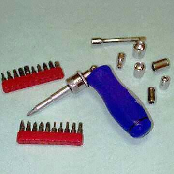 Three-way ratchet screwdriver with handle that stores bits