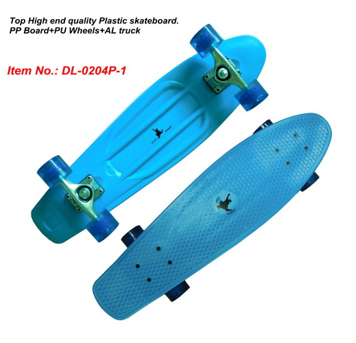 Top High end quality Plastic skateboard. Size:28*7.5inch. Material: High quality PP. Single Kick and concave shape for professional skateboarder. With 5inch Stronger style Aluminum truck and Base. PU injection cushion 99A. 60*45mm high rebound casting wheels 78A. ABEC-5 carbon speed bearing.