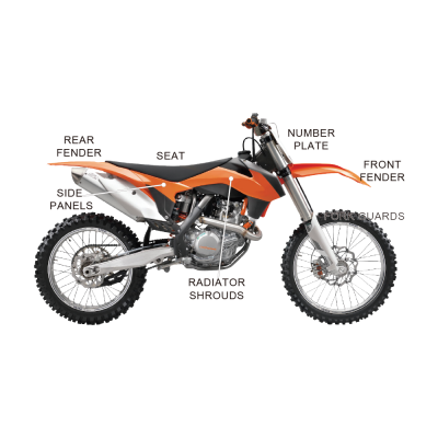 - Packaged Content(s): hardware for front fender, fork guards, number plate, seat, radiator shrouds, rear fender, and side panels