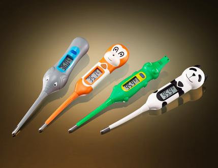This is a 10-second Swift Bendable digital thermometer with beeper, memory and fever alarm. These thermometers with cute animal features are suitable for kids to use. There are five different animal features such as: alligator, mon key, panda, dinosaur, pig and elephant.