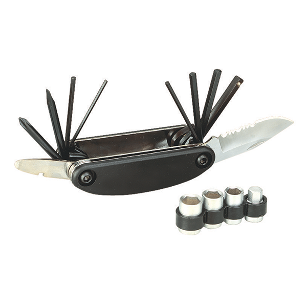 8mm hex bit, stainless knife, tire lever.