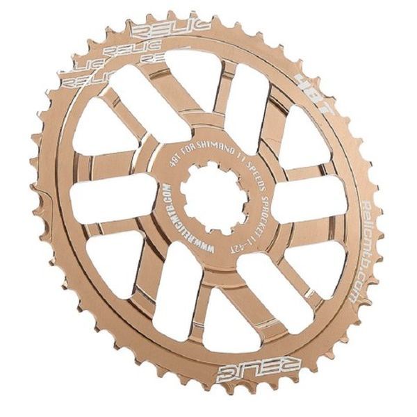 To upgrade Shimano 11-spd sprocket gear ratio with Relic 46T & 48T sprockets, which provide more cassette range to be compatible with Shimano 11-speed drivetrain for both SGS and GS, M8000(XT)/M9000(XTR), sprocket 11-40/42T; the 18T sprocket replaces 17T and 19T to make well-shifting in the cassette progression. The new combination reaches the super mega range gear ratio for optimum performance.