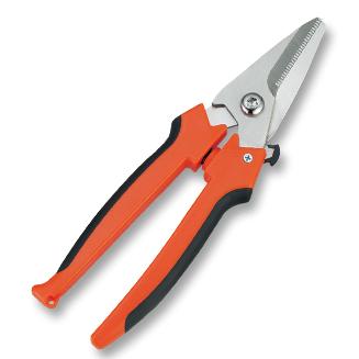 Combination shears for cutting cardboard, plastic and aluminum.