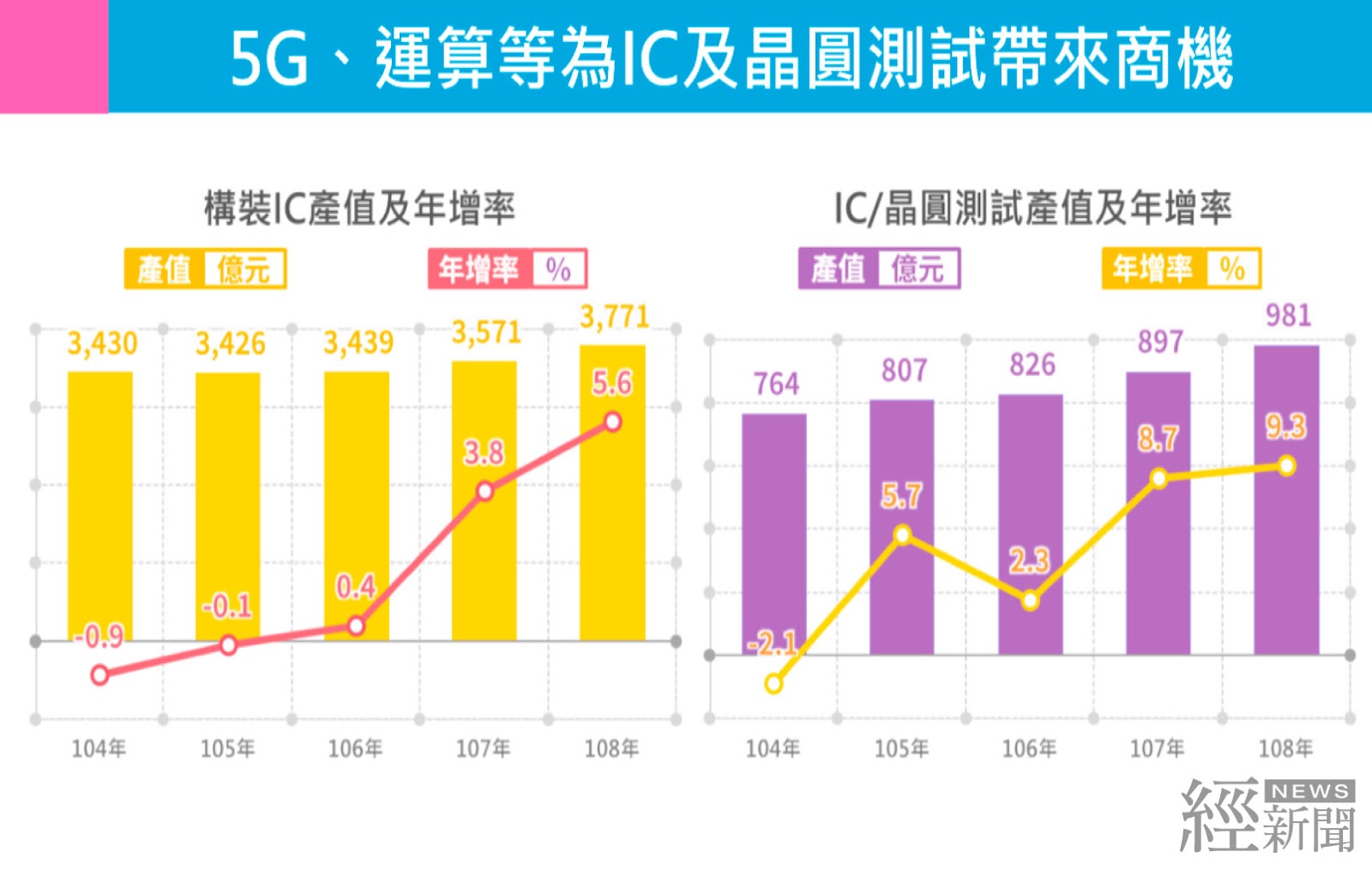 此外,5G、AI應用及高效能運算需求強勁,也推升高階晶圓及封裝需求,帶動108年構裝IC及晶圓測試產值續創新高,分別年增5.6%年增9.3%。